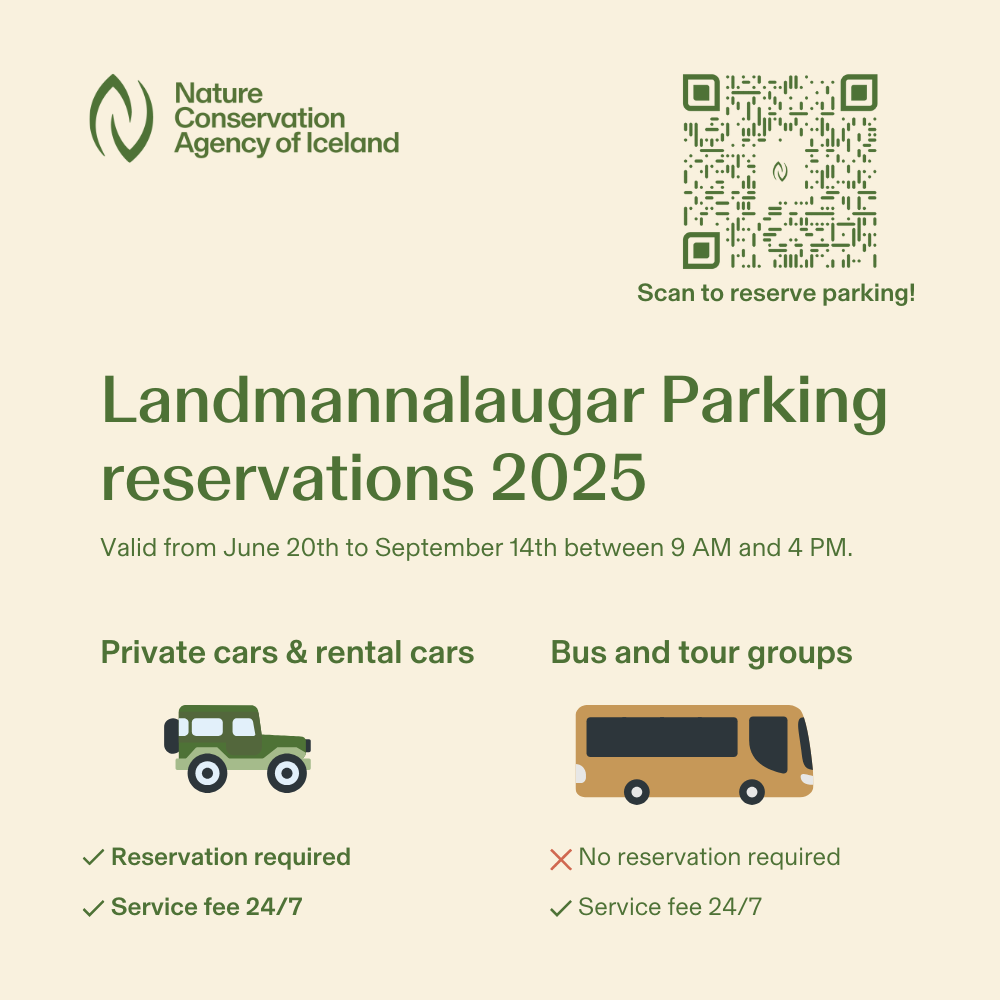 Between June 20th and September 15th, 2025, guests driving themselves (in a private or rental car) to Landmannalaugar between 9 AM and 4 PM must reserve parking spaces and pay a service fee prior to arrival. For more information see The Environment Agency of Iceland website.