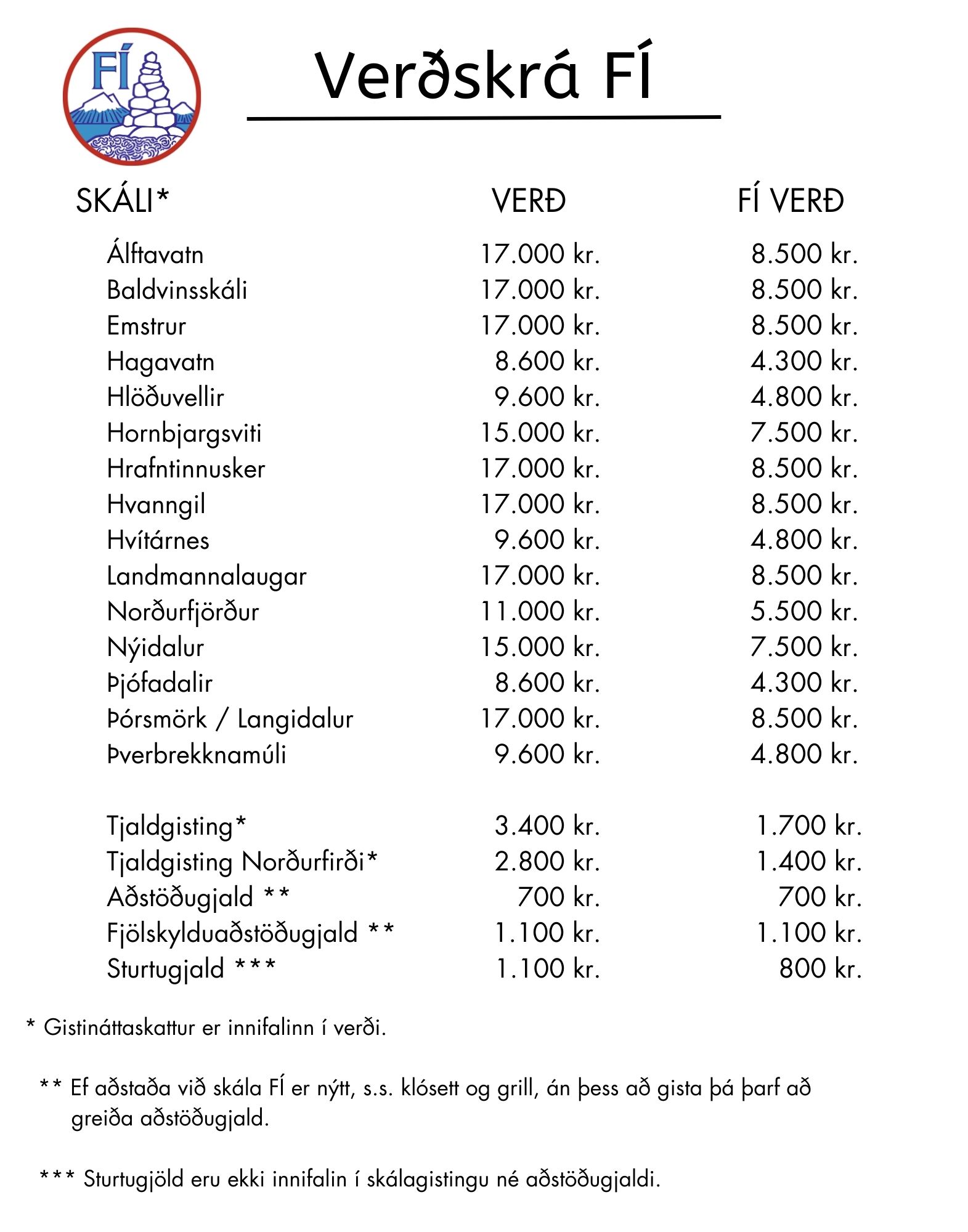 Félagsmenn í Ferðafélagi Íslands fá afslátt í alla skála og tjaldsvæði félagsins. Afsláttur félagsmanna gildir einnig fyrir maka og börn að 18 ára aldri í fylgd félagsmanns.