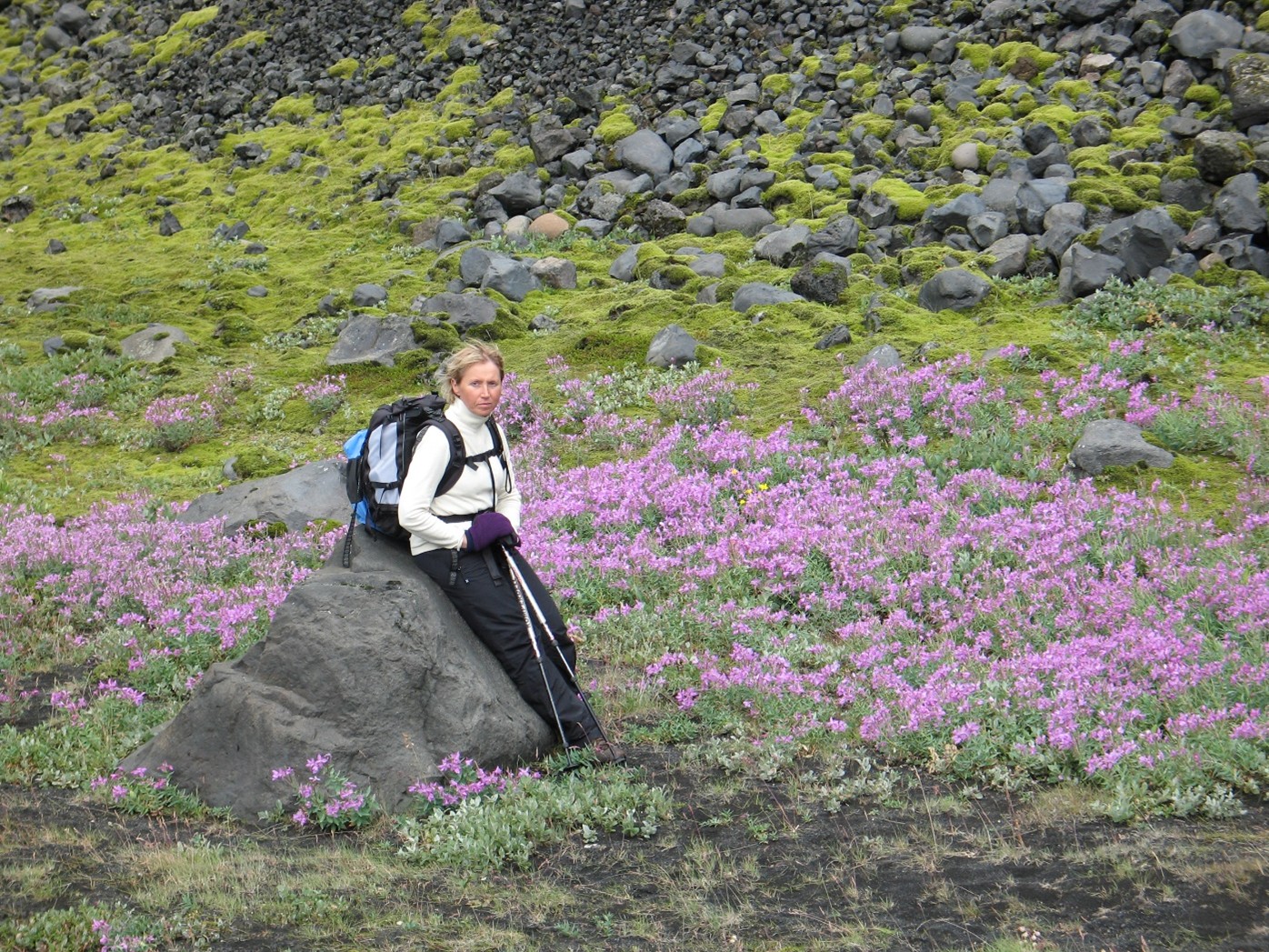 Á þessum punkti höfum við allt Suðlandsundirlendið fyrir fótum okkar. Mest ber þar á Tindfjöllum og Tindfjallafjökli, síðan er það Eyjafjallajökull og lengst í vestri er það drottningin sjálf Hekla. Allt blasir þarna við okkur en niðurgangan er í gegnum mjög þéttan og krækilóttan birkisóg sem er mjög erfitt er að komast í gegnum. Ég fór þarna niður í fyrsta skipti sem ég gekk þarna en það var líka nóg. Best er að ganga svolítð i austur , þannig kemst maður framhjá skóginum. Þegar niður á sléttlendið er komið er fylgt kindagötum. Þar er gróðurinn líka allt annar. Heilmikið ber þar á lúpínu, fjalldrapa, eyrarós og lambagrasaþúfum. Einnig sést þar