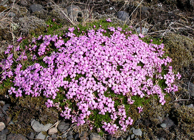holtasóley sem er þjóðarblómið. Talsvert ber á maríustakk og víða er vallhumall