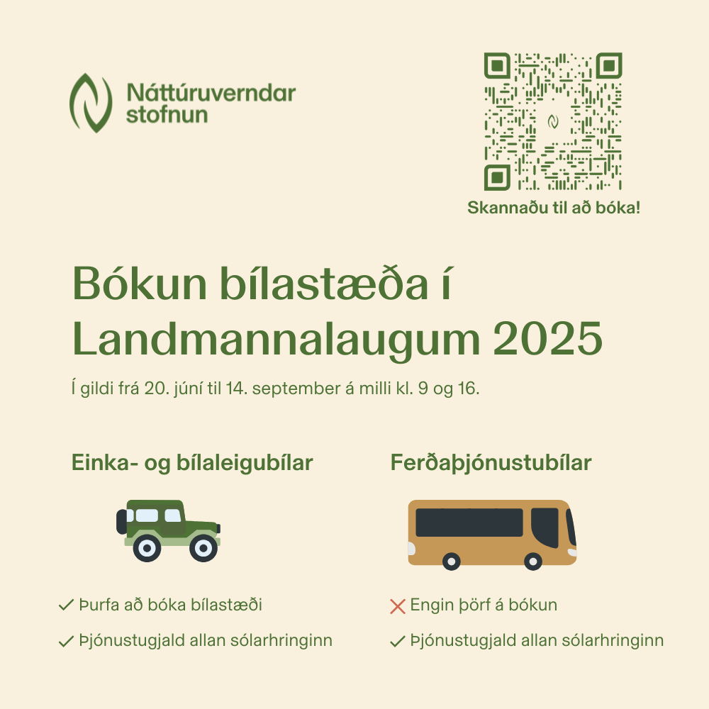 Frá 20. júní til 14. september 2025 þurfa gestir sem koma akandi á eigin vegum á milli kl. 9 og 16 að bóka bílastæði fyrirfram og greiða þjónustugjald áður en komið er í Landmannalaugar.