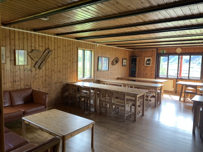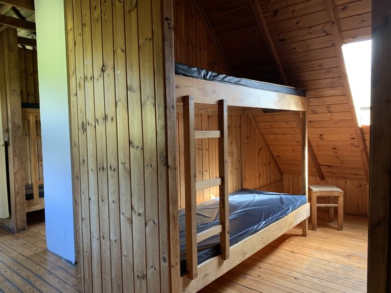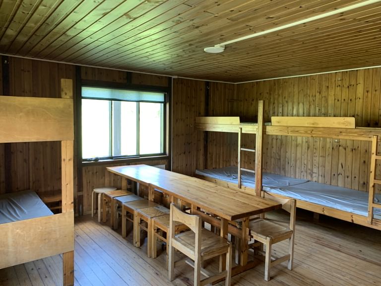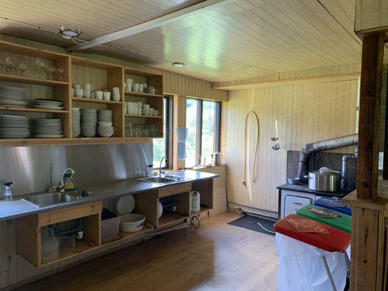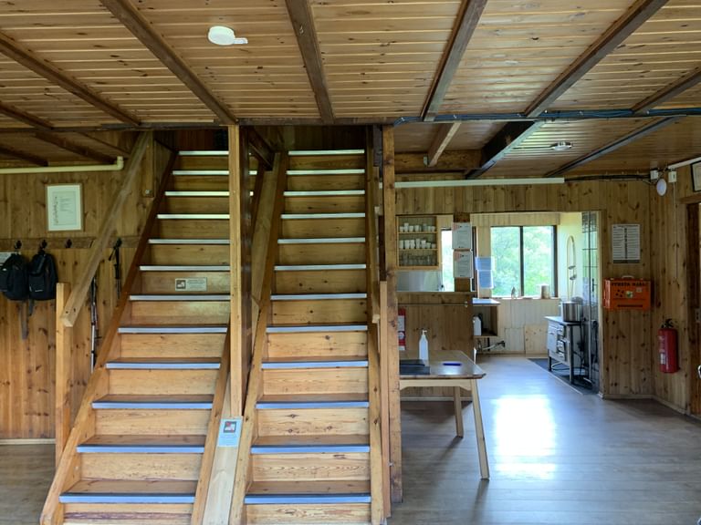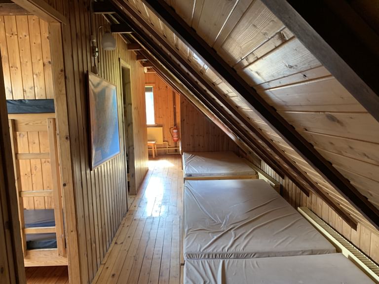 On the ground floor of the hut is a spacious entrance, two kitchens, one big and one small, both fully equipped with all utensils and running cold water, a big dining hall, and two sleeping halls with bunk beds. In the attic, there are more bunk beds located in three separate quarters.