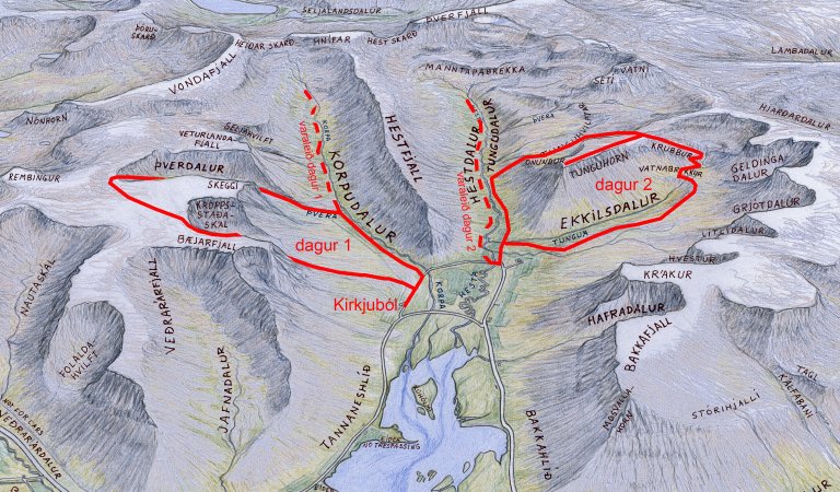 Dagleiðirnar eru þó ekki langar og ekki þarf mikið að vaða. Landsvæðið hefur verið kortlagt sérstaklega og gönguleiðirnar eru til í Wappi Einars Skúlasonar. En þessa helgina njótum við leiðsagnar fróðs heimamanns, Stefáns Pálssonar. Hann býður upp á láglendisgöngur ef ekki viðrar til fjallganga. Hann sér einnig um ferðaþjónustuna í Kirkjubóli í Korpudal þar sem gist verður.- Brottför/Mæting