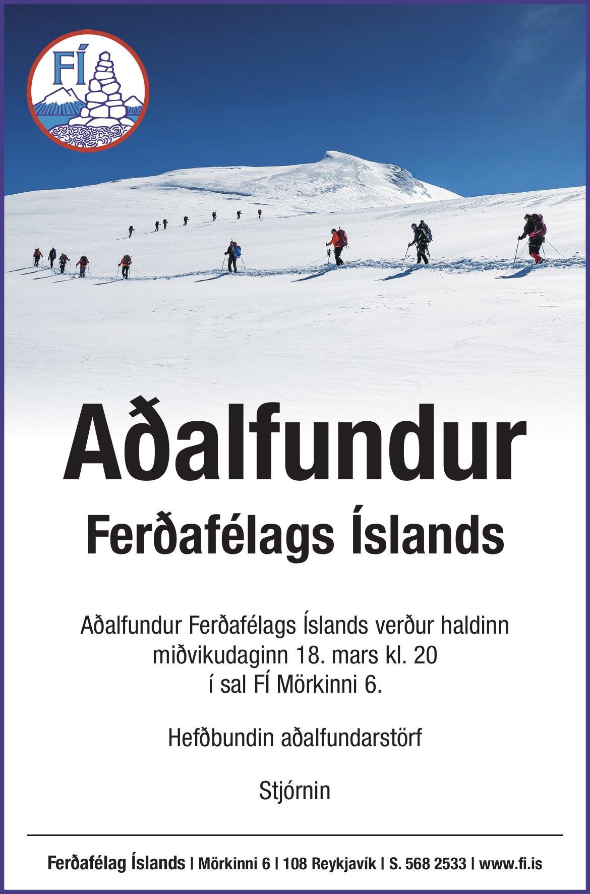 Aðalfundur Ferðafélags Íslands verður haldinn miðvikudaginn 18. mars kl. 20 í sal FÍ Mörkinni 6.