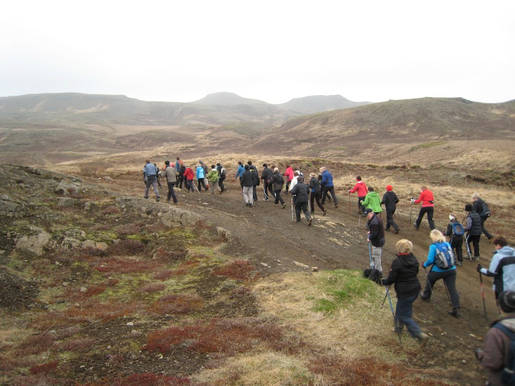 Þegar komið er á hæsta tindinn má vel halda áfram til austurs eftir skýrri slóð sem liggur yfir á lágan koll ( GPS N. 64.08.661 w. 21.42.477) sem er austan við þann hæsta. Svo þræða menn sig til baka ofan í lægð milli þessara tveggja kolla og halda þar niður, svo dálítið upp á ný og rekja sig svo meðfram fjallinu aftur til baka vestur að skógræktarlundinum.