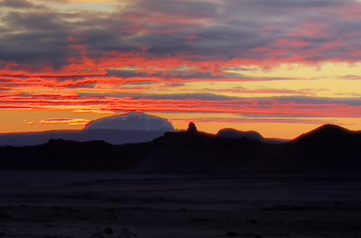 2.d. Ekið frá Dreka í gegnum úfin hraun að rótum Herðubreiðar á móts við Kollóttudyngju. Gengið á tind Herðubreiðar um skriður og brött klettabelti. Að lokinni göngu er ekið svokallaða Lindabaksleið að Sigurðarskála í Kverkfjöllum, þar sem gist verður í tvær nætur. Kvöldganga er á Virkisfell (1108 m), þar sem í góðu veðri má fylgjast með miðnætursólinni hníga til viðar bak við Dyngjufjöll og Herðubreið. Ganga: 9 km. Hækkun: 1000 m.Göngutími: 56 klst.