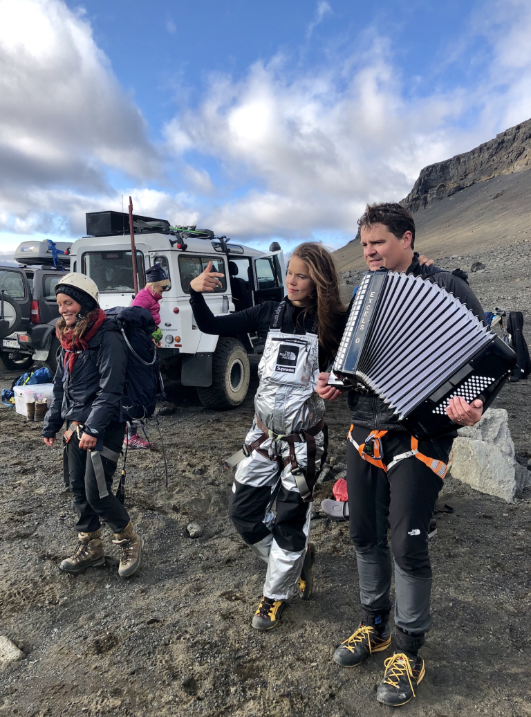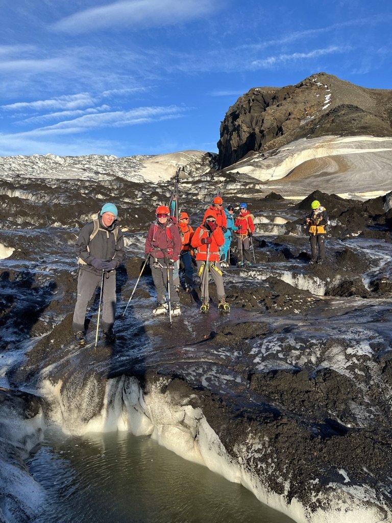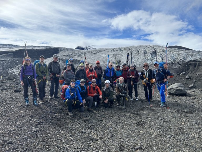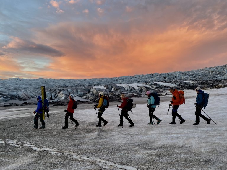 Jöklabúnaður er nauðsynlegur; ísöxi, jöklabroddar, göngubelti með karabínu og hjálmur.