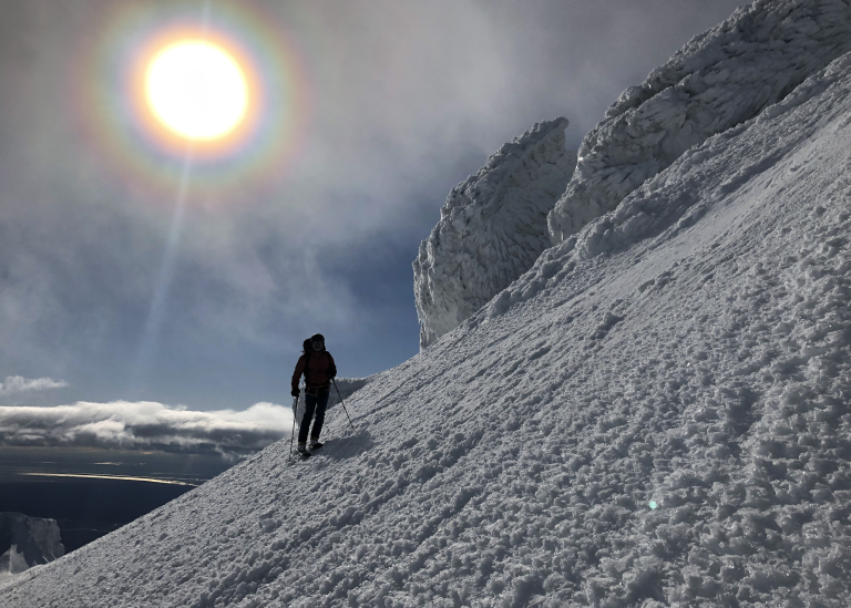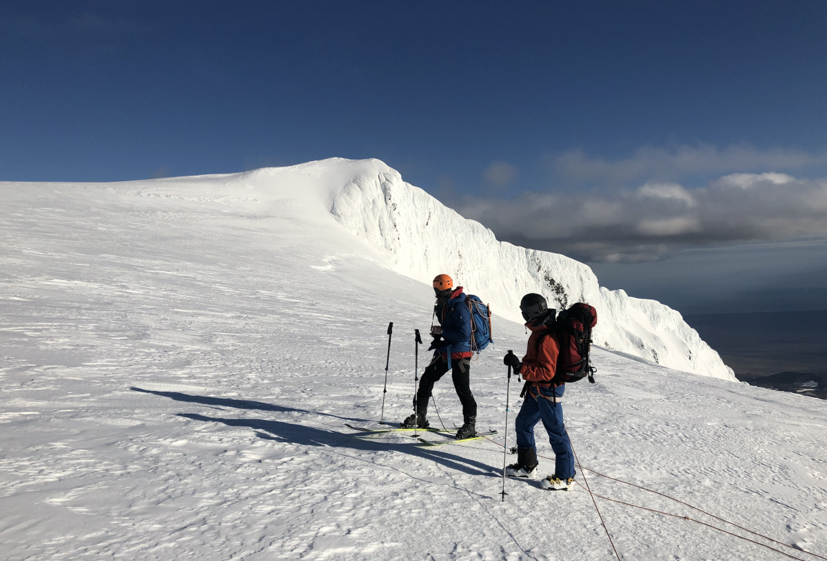 Það er ógleymanlegt að sigrast á hæsta tindi landsins gangandi, en enn tilkomumeira á fjallaskíðum, enda brekkan niður af Hvannadalshnjúki einhver lengsta skíðabrekka landsins. Gengin er hefðbundin Sandfellsleið, þar af fyrstu 2 - 3 klst. með skíðin á bakinu upp í 700 m hæð. Þaðan er farið á skinnum upp að Línusteini þar sem farið er í línu áður en haldið er áfram upp svokallaða „Dauðabrekku“ að brún öskjunnar í um 1800 m hæð.